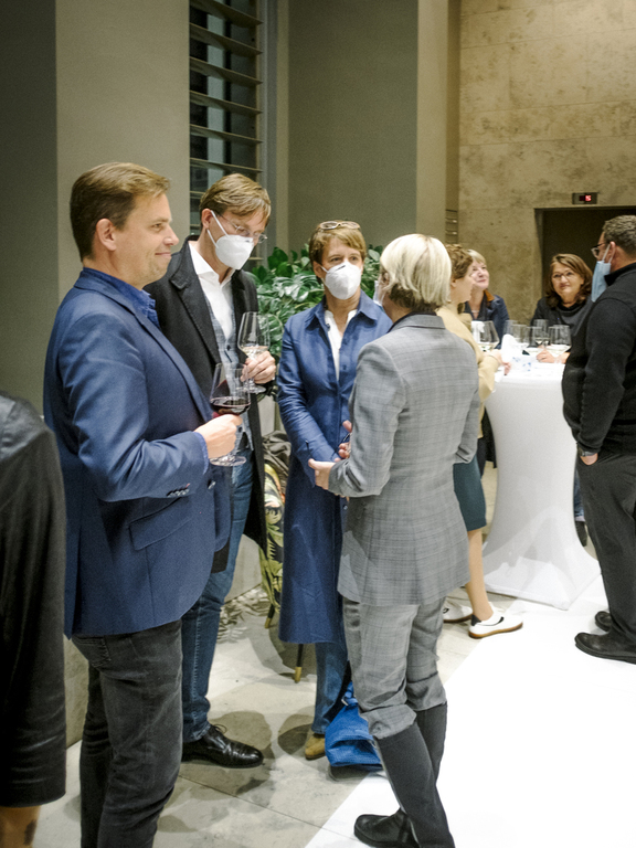 Die „Alliierten“ regen, so der Ausblick und der Tenor im anschließenden Dialog der Anwesenden bei Pianomusik des Künstlers Thomas Putensen, auch weiter zum Erinnern und Nichtvergessen sowie zum Nachdenken darüber an, welche Welt wir künftigen Generationen hinterlassen wollen. In diesem Zusammenhang wies sie kurz auf gegenwärtige und künftige Förderprojekte der Stiftung hin, die trotz und gerade in der Krise zu realisieren seien. Zu den Anwesenden gehörte der Künstler selbst, der sich nach der Eröffnung im Dialog mit dem interessierten Publikum wiederfand.