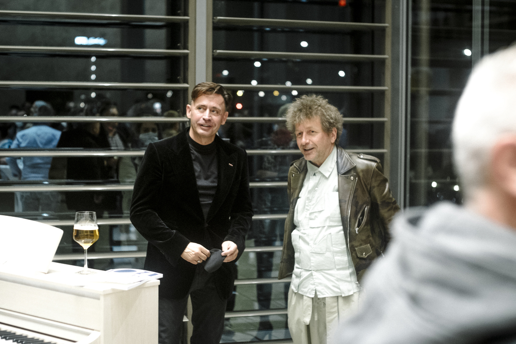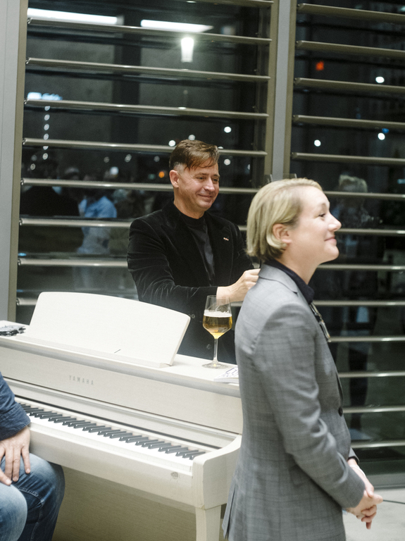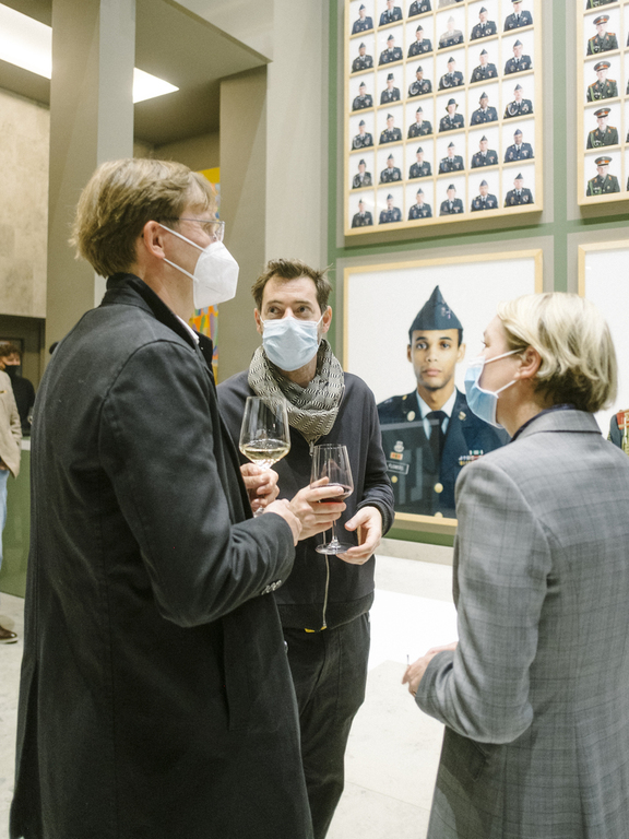 Die „Alliierten“ regen, so der Ausblick und der Tenor im anschließenden Dialog der Anwesenden bei Pianomusik des Künstlers Thomas Putensen, auch weiter zum Erinnern und Nichtvergessen sowie zum Nachdenken darüber an, welche Welt wir künftigen Generationen hinterlassen wollen. In diesem Zusammenhang wies sie kurz auf gegenwärtige und künftige Förderprojekte der Stiftung hin, die trotz und gerade in der Krise zu realisieren seien. Zu den Anwesenden gehörte der Künstler selbst, der sich nach der Eröffnung im Dialog mit dem interessierten Publikum wiederfand.