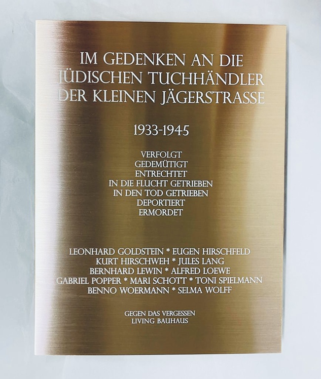 und individuell gestaltete Bronzetafeln gravieren lassen, die an die Tuchhändler in der Kleinen Jägerstraße erinnern,